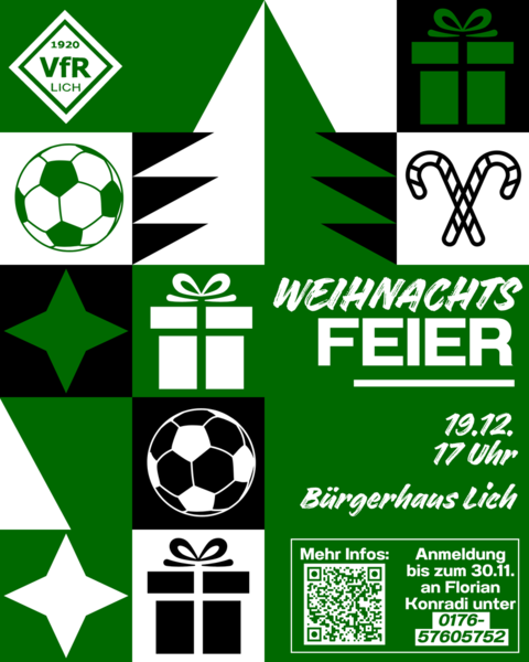 die Spieler unserer Ersten und Zweiten Mannschaft freuen sich sehr, Sie in diesem Jahr zur gemeinsamen Weihnachtsfeier am Freitag, den 19. Dezember, im Licher Bürgerhaus herzlich willkommen zu heißen.